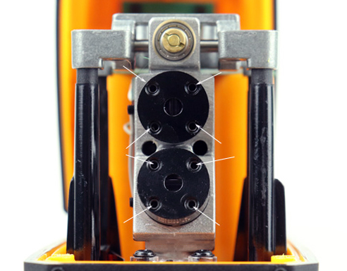La regolazione della posizione del modulo laser viene effettuata con 3 piccoli bulloni esagonali: quelli superiore e inferiore si inseriscono nel modulo e quello centrale lo fissa in posizione. Allentare e stringere questi bulloni un po’ alla volta.