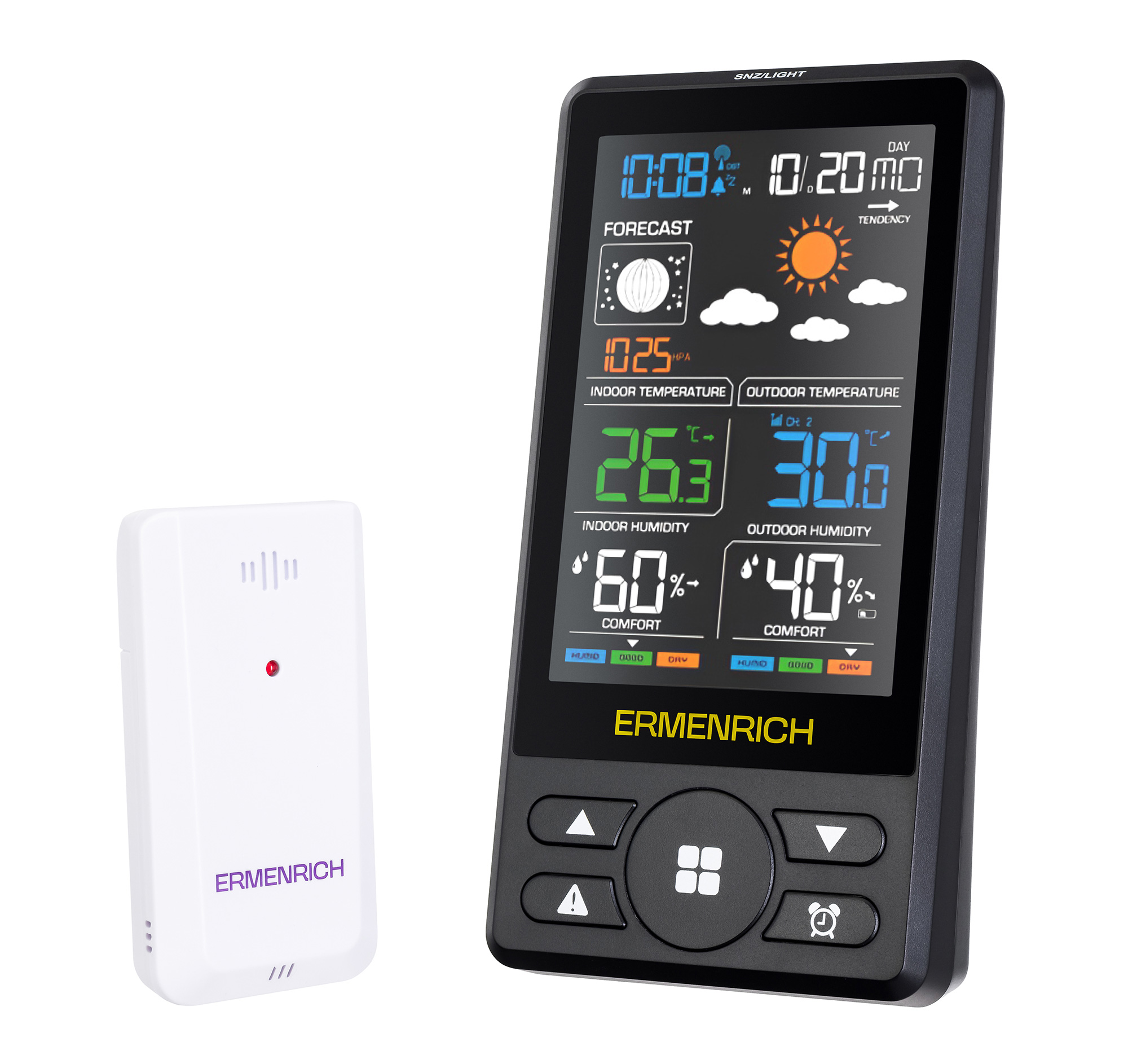La stazione meteorologica domestica Ermenrich Report WR50 dispone di un’ampia gamma di funzionalità, che sono preziose nella vita di tutti i giorni. Aiuta a monitorare i cambiamenti meteorologici esterni e a controllare il microclima interno. Il grande schermo a colori visualizza tutte le informazioni importanti sull’atmosfera: temperatura e umidità interna ed esterna, pressione atmosferica, previsione meteorologica e livello di comfort. Il dispositivo può anche funzionare come orologio e calendario digitali, con la parte inferiore dello schermo dedicata a queste informazioni. Se posizionato su un comodino, può anche servire da sveglia. Coloro che si interessano di astronomia o di segni popolari saranno lieti di vedere un altro utile parametro visualizzato sullo schermo: le fasi lunari.
